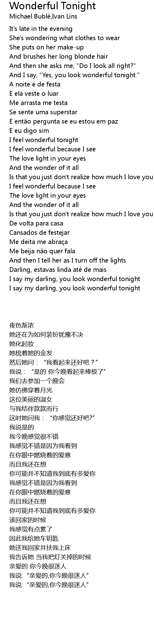 | [03:29.44] | I say my darling, you look wonderful tonight |