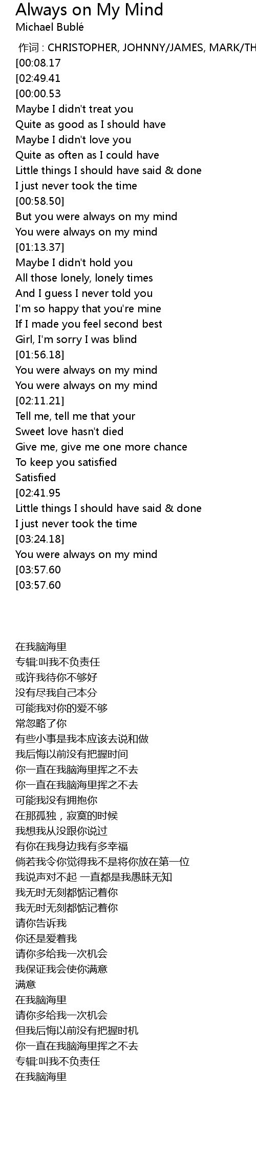 | [04:05.24][02:49.41][00:02.07] | Michael BubleAlways On My Mind |