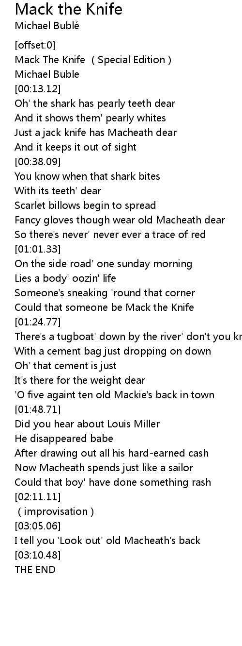 | [00:27.84] | Just a jack knife has Macheath dear |
