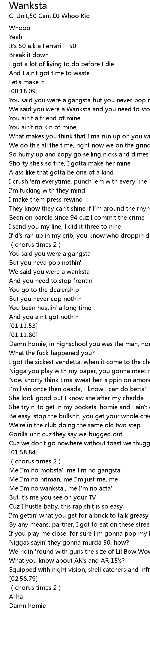 | [00:21.18] | We said you were a Wanksta and you need to stop frontin' |