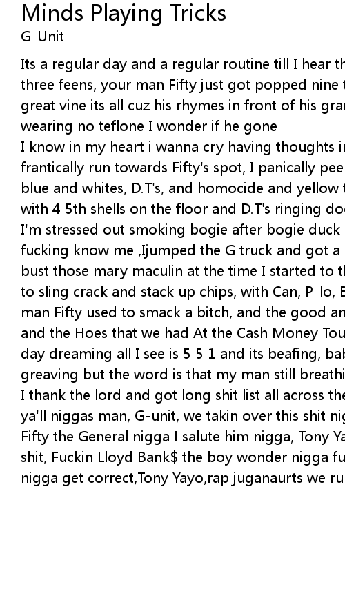 I know in my heart i wanna cry having thoughts in my mind that man goin die as I frantically run towards Fifty's spot, I panically peep like fifty cops , it was blue and whites, D.T's, and homocide and yellow tape blocked off on both sides with 4 5th shells on the floor and D.T's ringing doorbells going door to door yo I'm stressed out smoking bogie after bogie duck in the sarce cuz the sarce fucking know me ,Ijumped the G truck and got a mac to spit and we did about to bust those mary maculin at the time I started to think back in shit how we used to sling crack and stack up chips, with Can, P-lo, Big Ju and The Kid, and my man Fifty used to smack a bitch, and the good and the bad on the one three four and the Hoes that we had At the Cash Money Tour now I'm at the hospital, stop day dreaming all I see is 5 5 1 and its beafing, baby mom screaming whole family greaving but the word is that my man still breathing, I dropped to my knees and I thank the lord and got long shit list all across the board motha fucker, fuck ya'll niggas man, G-unit, we takin over this shit nigga, |