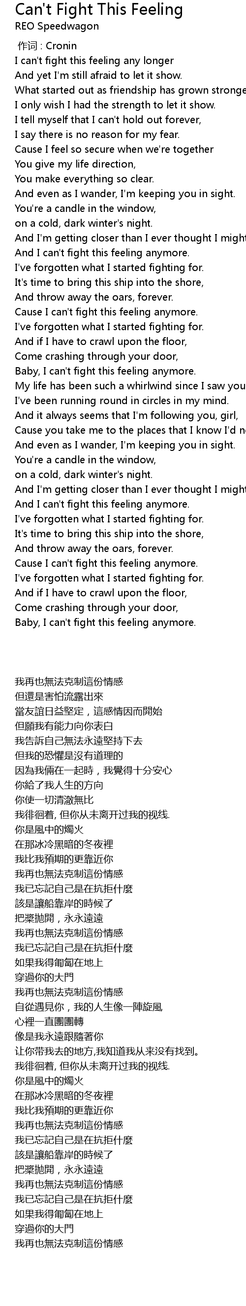 | [02:15.000] | Baby, I can' t fight this feeling anymore. |