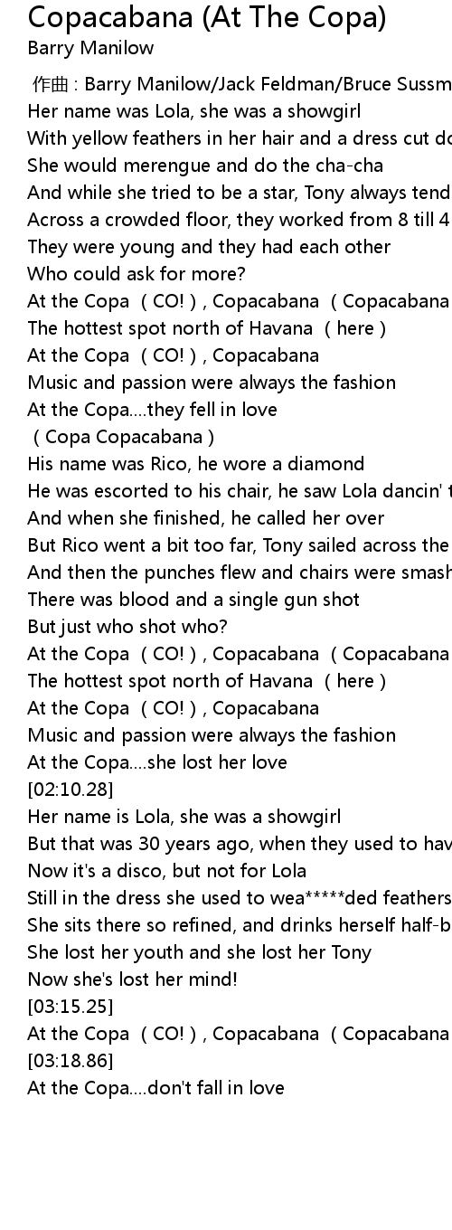 | [03:16.18] | At the Copa (CO!), Copacabana (Copacabana) |