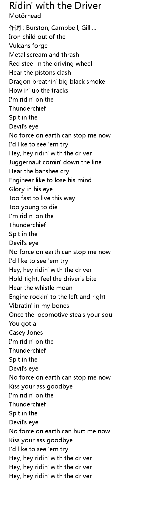 | Hey, hey ridin' with the driver | |
