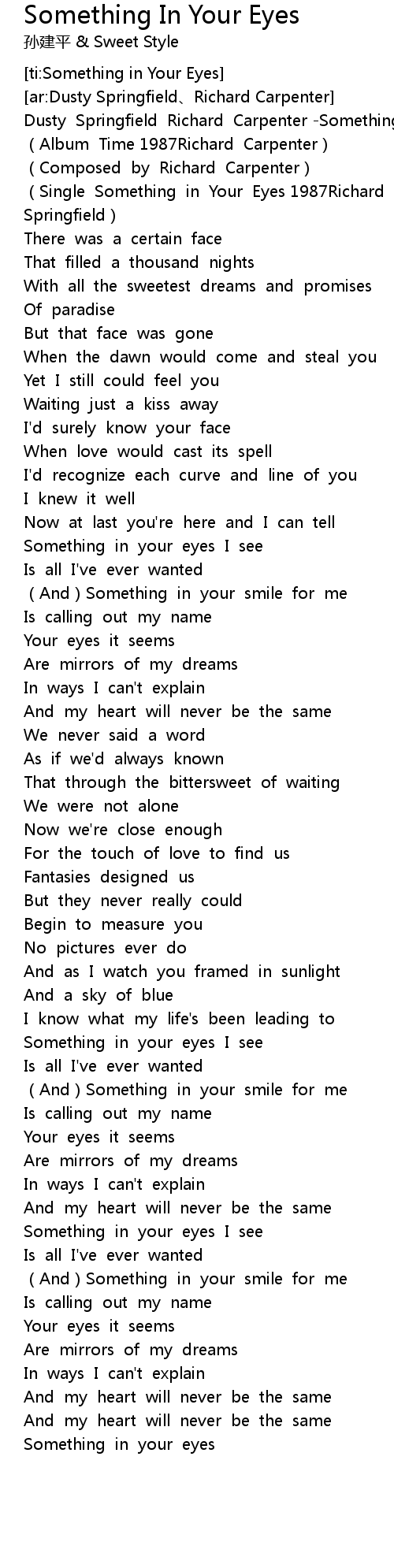 | [00:00.640] | Dusty Springfield Richard Carpenter -Something In Your Eyes |