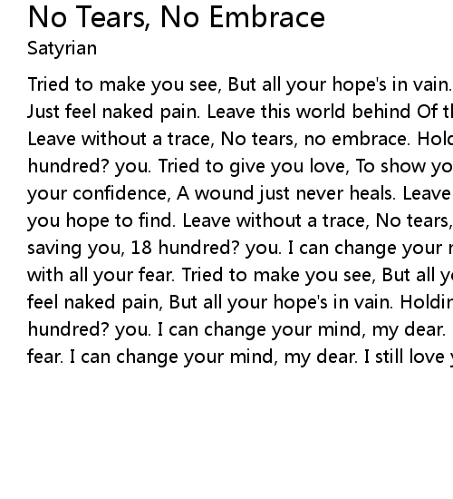 | Tried to make you see, But all your hope's in vain. But you can see that I'm? Just feel naked pain. Leave this world behind Of that place you hope to find. Leave without a trace, No tears, no embrace. Holding tight I'm saving you, 18 hundred? you. Tried to give you love, To show you how it feels, But you lost all your confidence, A wound just never heals. Leave this world behind Of that place you hope to find. Leave without a trace, No tears, no embrace. Holding tight I'm saving you, 18 hundred? you. I can change your mind, my dear. I still love you with all your fear. Tried to make you see, But all your hope's in vain. You just feel naked pain, But all your hope's in vain. Holding tight I'm saving you, 18 hundred? you. I can change your mind, my dear. I still love you with all your fear. I can change your mind, my dear. I still love you with all your fear. |