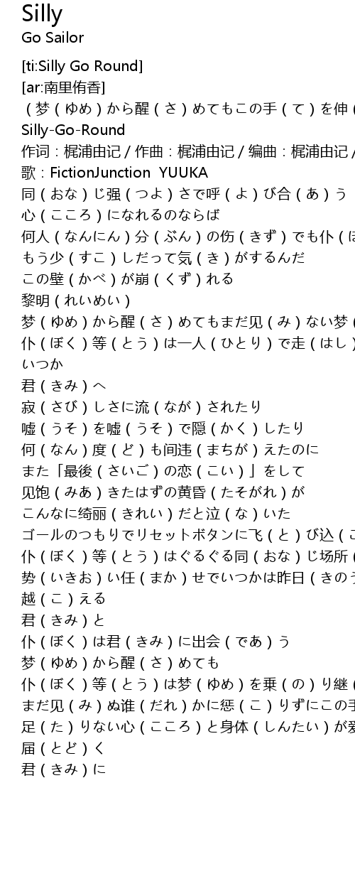 | [01:02.571] | 梦(ゆめ)から醒(さ)めてもまだ见(み)ない梦(ゆめ)の方(ほう)まで |