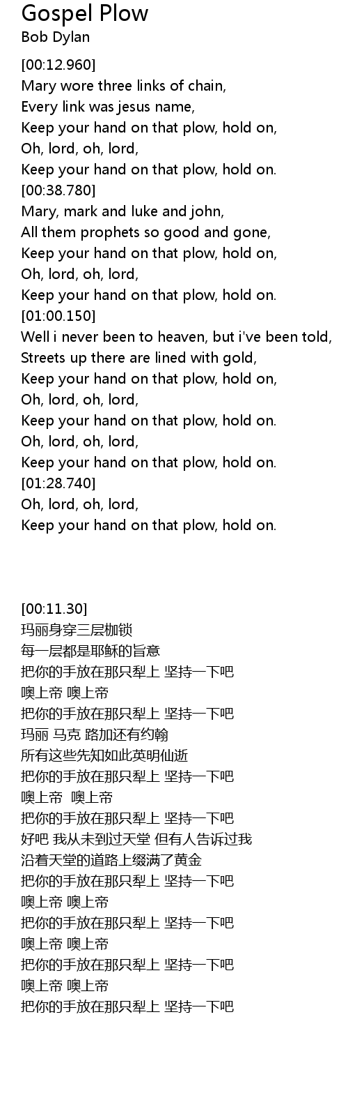 | [00:42.750] | Keep your hand on that plow, hold on, |