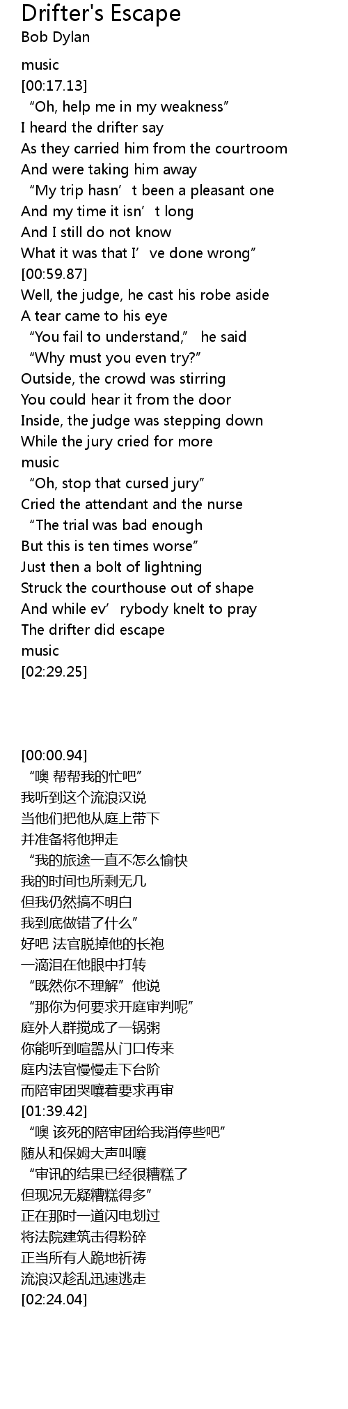 | [02:17.50] | The drifter did escape |