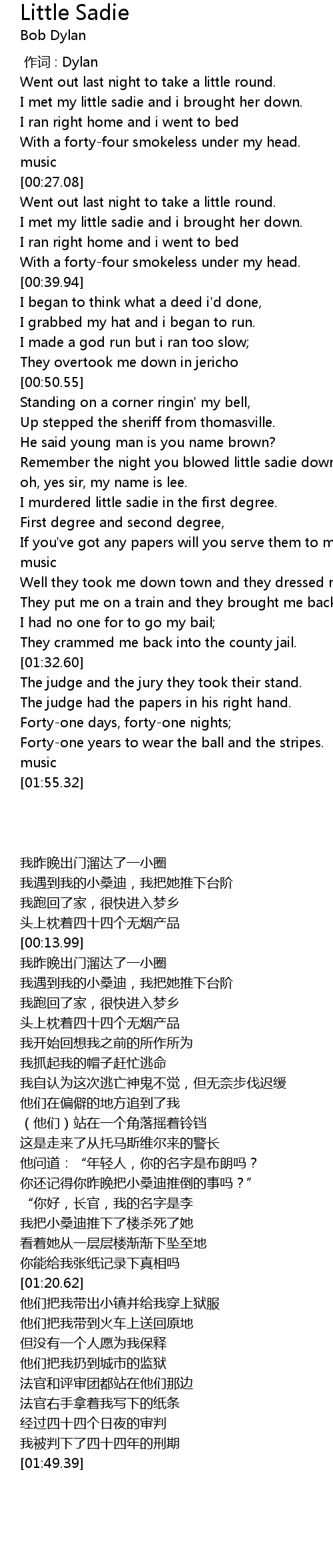 | [01:06.99] | I murdered little sadie in the first degree. |