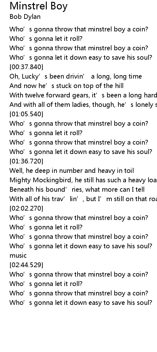 | [01:19.270] | Who’s gonna throw that minstrel boy a coin? |