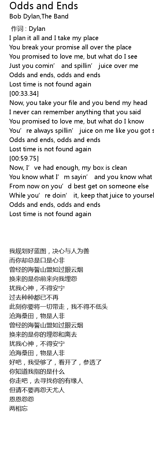 | [01:31.30] | Odds and ends, odds and ends |