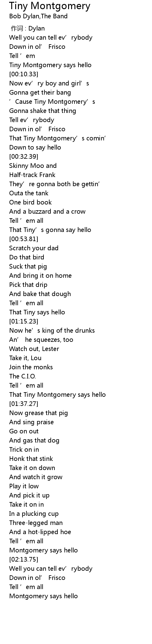 | [00:07.92] | Tiny Montgomery says hello |