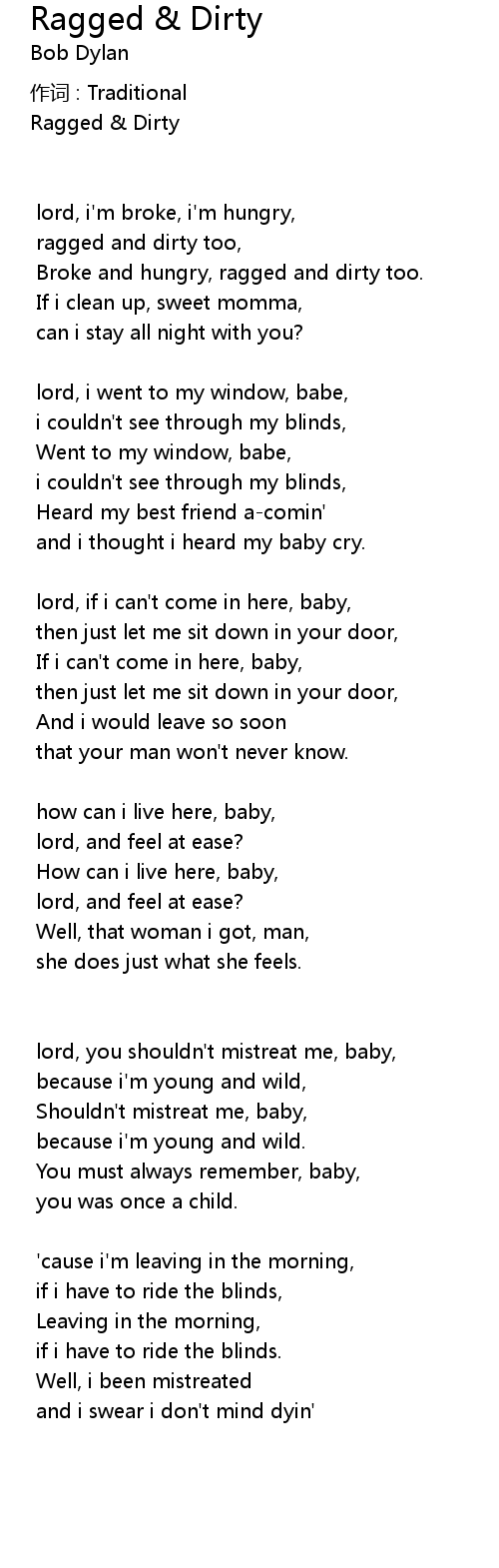 | Broke and hungry, ragged and dirty too. | |