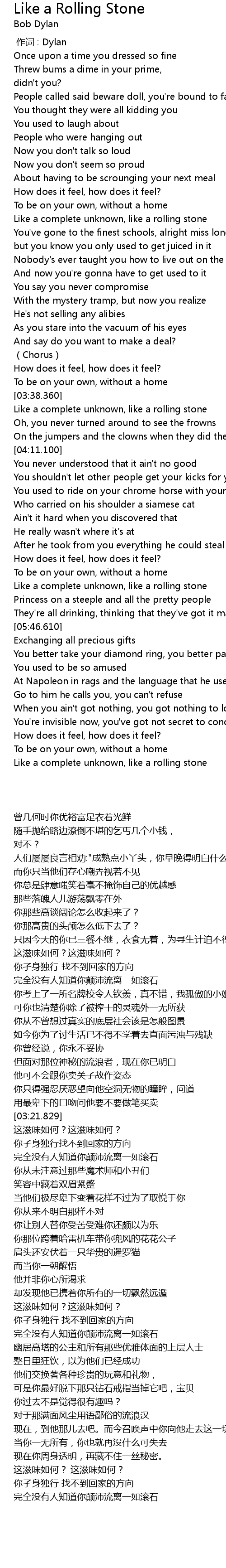 | [03:42.540] | Like a complete unknown, like a rolling stone |