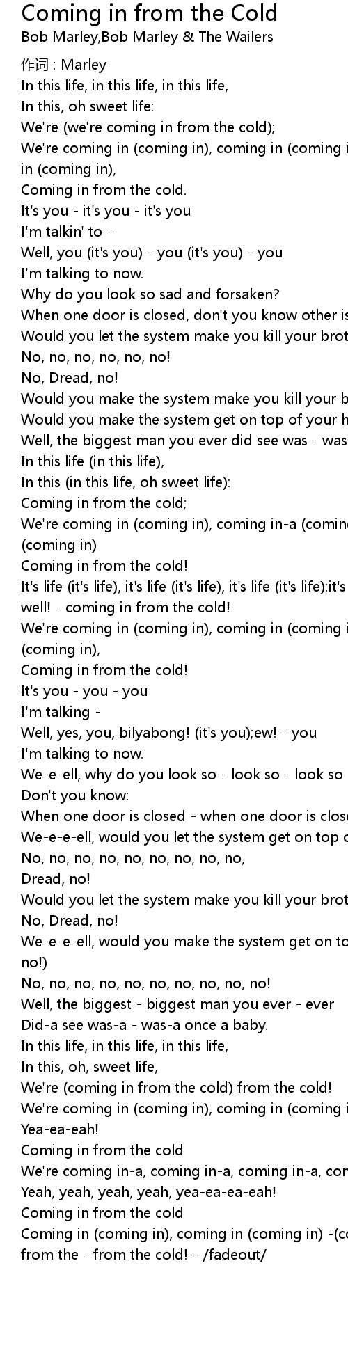 | Coming in (coming in), coming in (coming in) -(coming in) (coming in)(coming in) from the - from the cold! - /fadeout/ |