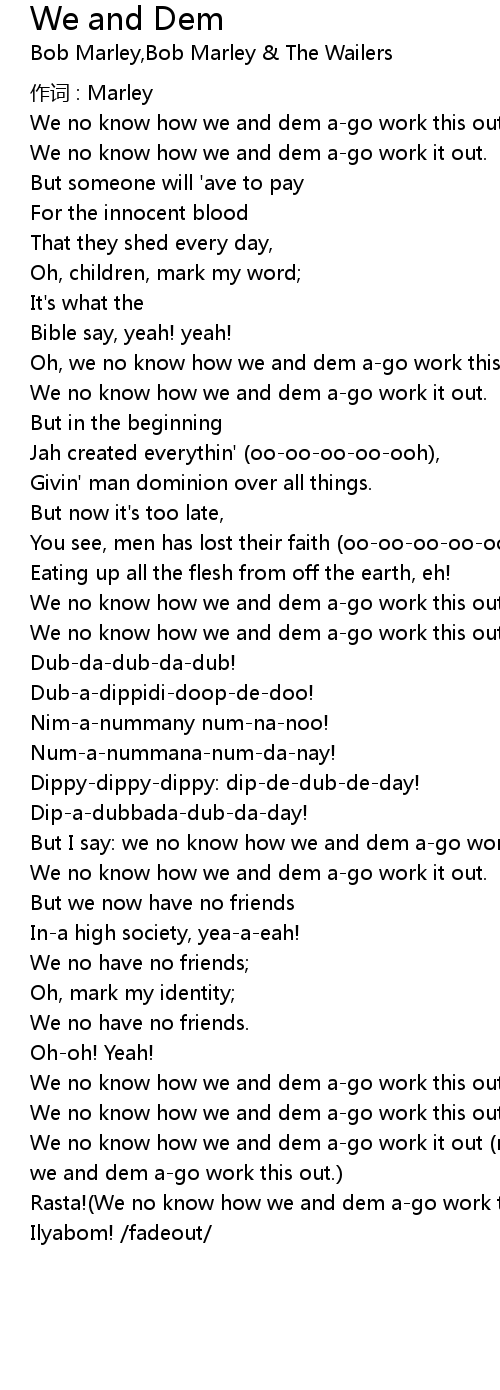 | We no know how we and dem a-go work it out (no, we don't know);(We no know how we and dem a-go work this out.) | |