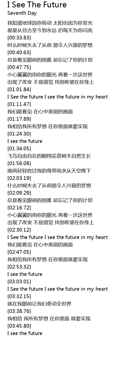 | [03:39.51] | wǒ xiāng xìn wǒ suǒ yǒu mèng xiǎng zài nǐ lǐ miàn jiù yào shí xiàn |