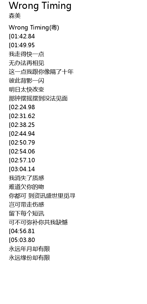 | [00:21.24][01:42.84][03:22.80][05:22.46] | 森美-Wrong Timing(粤) |
