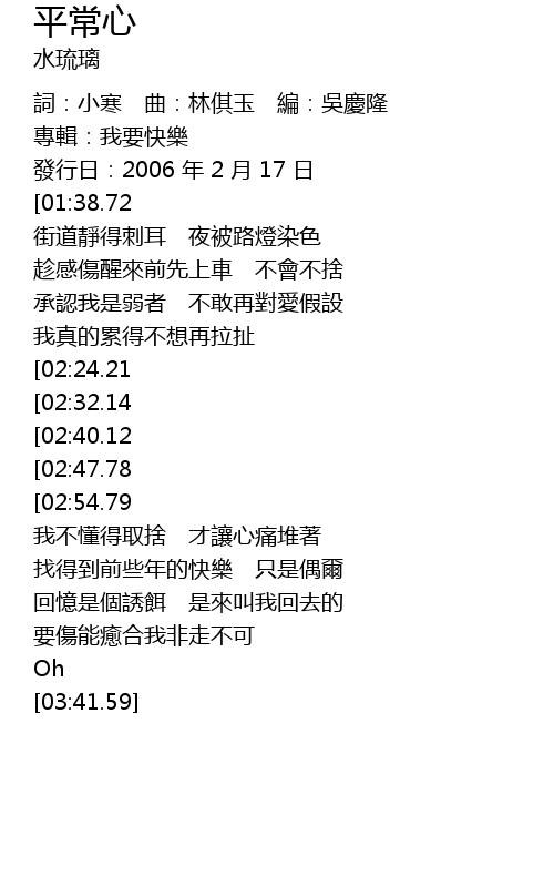 | [01:12.49][02:32.14][03:11.91] | 帶著一顆平常心 不必為誰心碎閉上眼睛 |