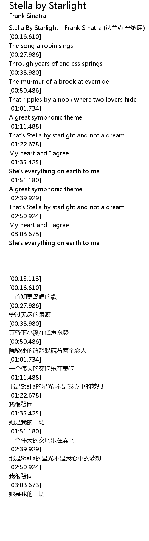 | [00:15.113] | Stella By Starlight - Frank Sinatra (法兰克·辛纳屈) |