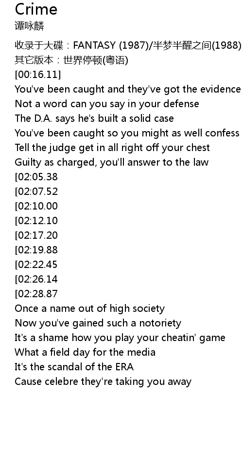 | [02:37.88][02:05.38][00:57.09] | Cause it's a crime |
