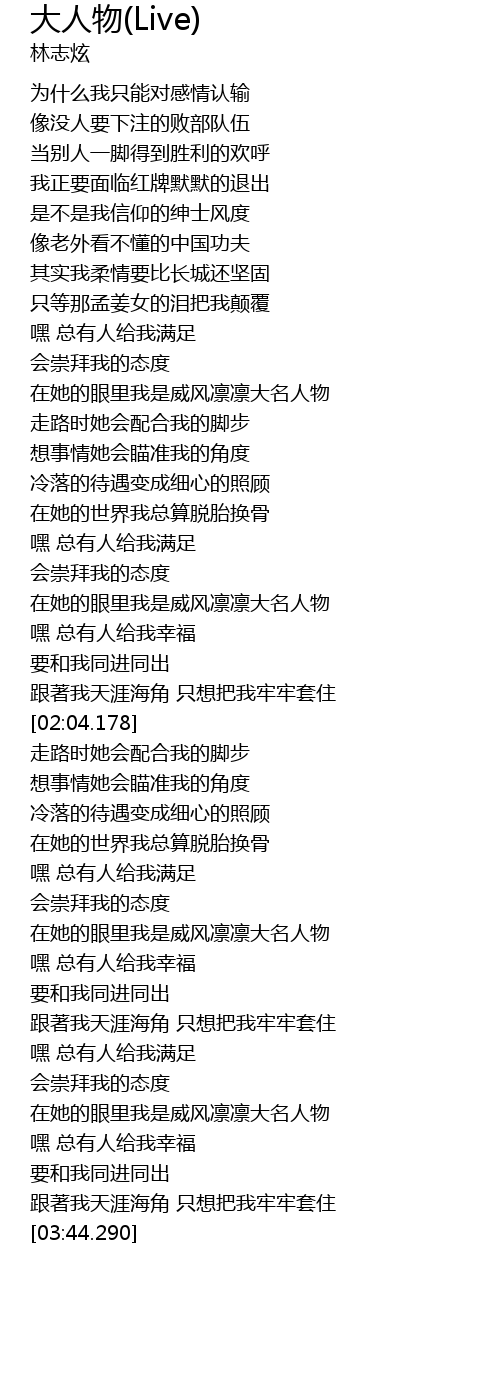 | [03:20.550] | 在她的眼里我是威风凛凛大名人物 |