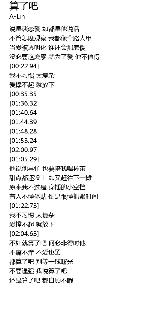 | [02:56.22][01:48.28][00:48.73] | bu yao ye ba wo shuo suan le ba |