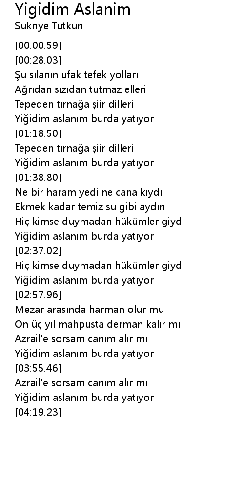 | [04:05.53] | Yiğidim aslanım burda yatıyor |