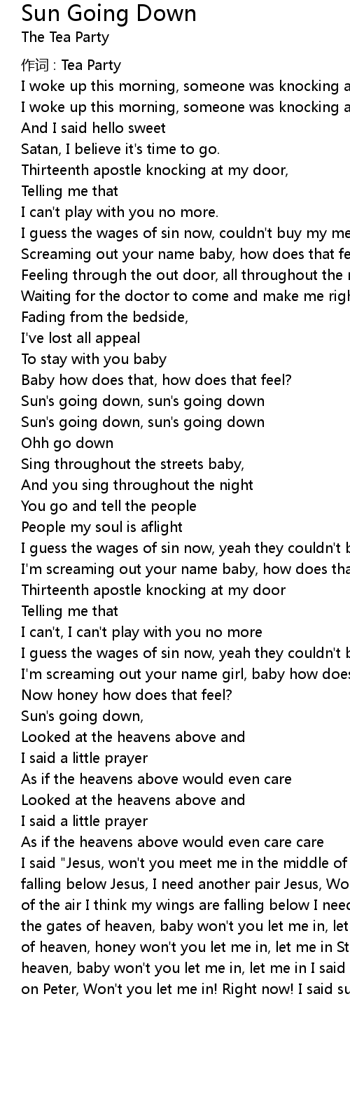 | I said "Jesus, won't you meet me in the middle of the air? I think my wings are falling below Jesus, I need another pair Jesus, Won't you meet me in the middle of the air I think my wings are falling below I need another pair" "St. Peter at the gates of heaven, baby won't you let me in, let me in St. Peter at the gates of heaven, honey won't you let me in, let me in St. Peter at the gates of heaven, baby won't you let me in, let me in I said now Peter, listen Peter, come on Peter, Won't you let me in! Right now! I said sun's going down, |