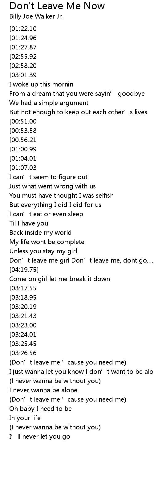 | [03:06.14][02:55.92][02:14.23][01:11.64][00:20.13] | So don' t leave me |