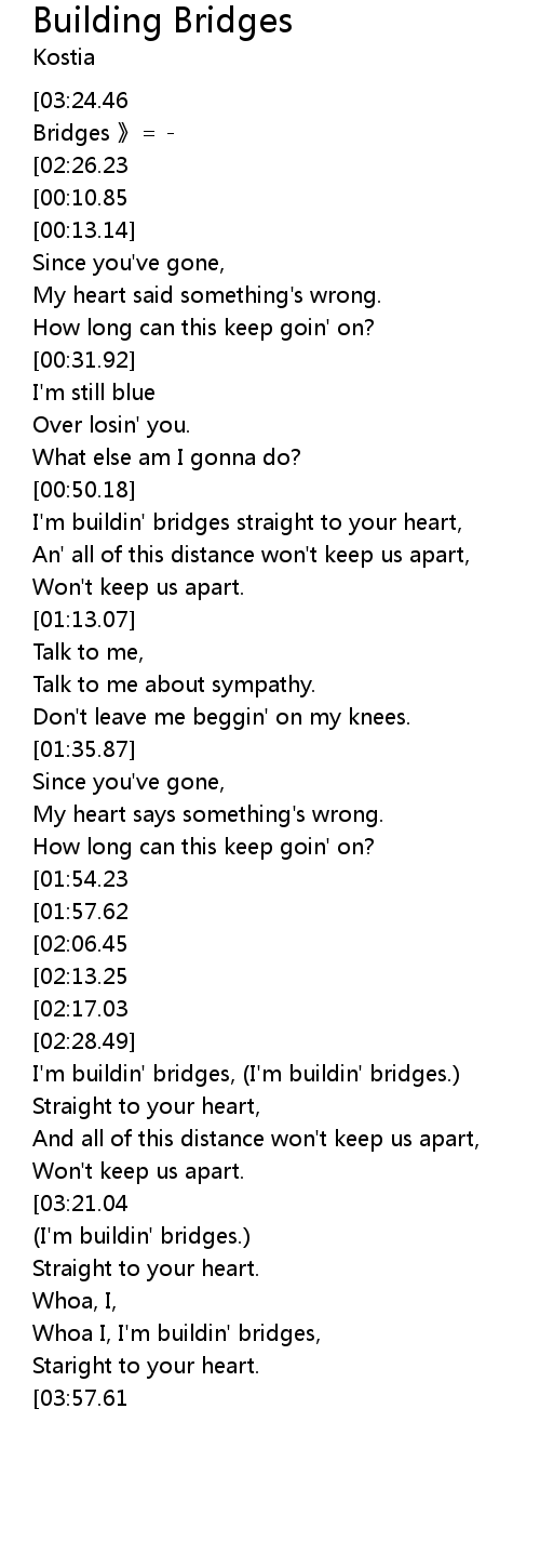 | [03:01.60] | I' m buildin' bridges, I' m buildin' bridges. |