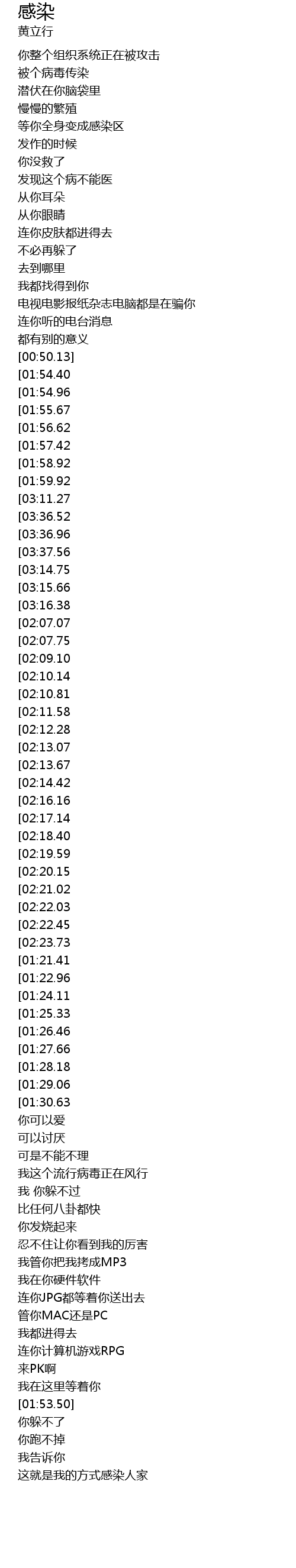 | [02:26.03][01:22.96] | 被个病毒传染 |