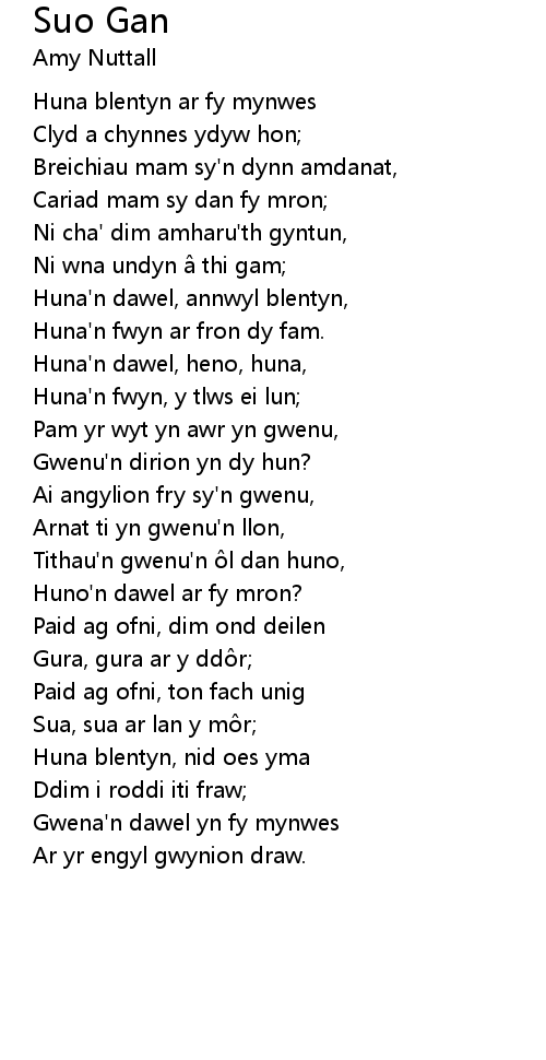 | Huna' n dawel, heno, huna, | |