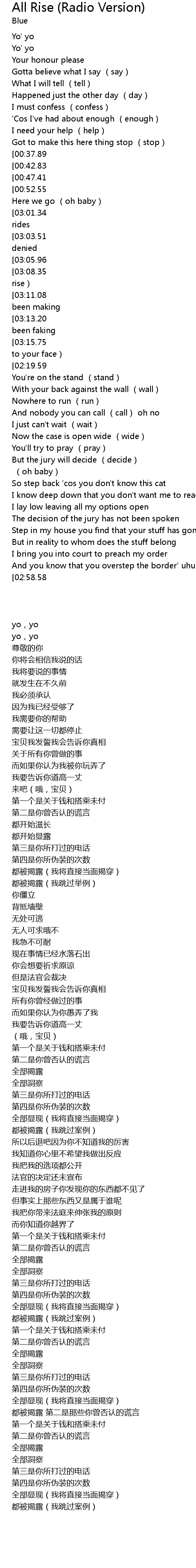 | [03:37.88][02:19.59][01:16.06] | All rise (I rest my case) |