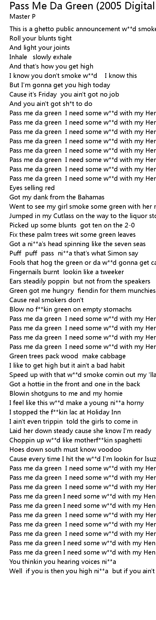 | [00:33.98] | Pass me da green I need some w**d with my Hennessy |