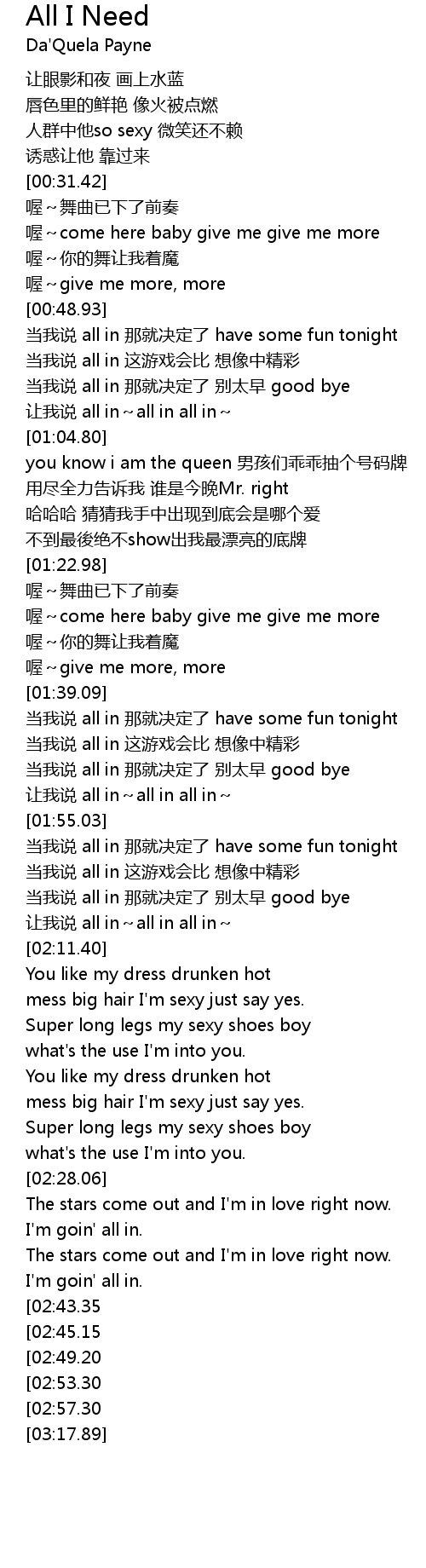 | [00:49.36] | 当我说 all in 那就决定了 have some fun tonight |