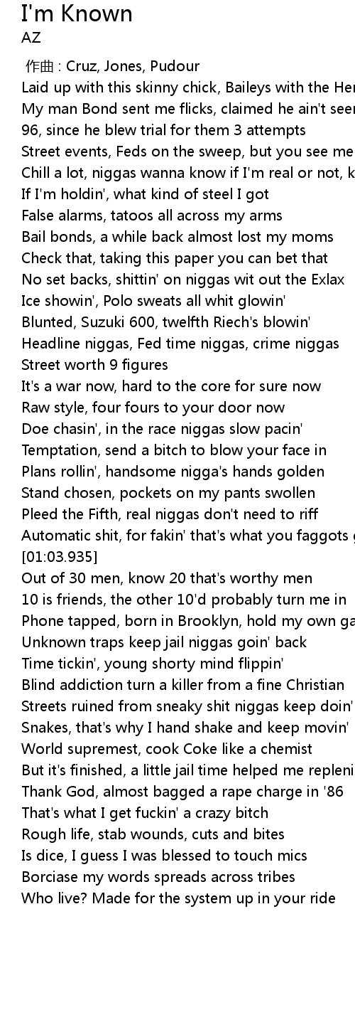 | [01:00.814] | Automatic shit, for fakin' that' s what you faggots get |