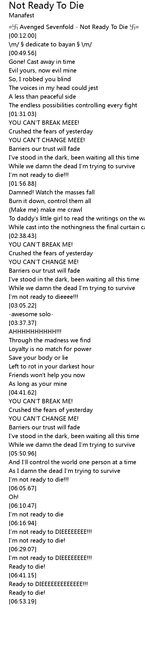 | [00:05.91] | ≡卐 Avenged Sevenfold - Not Ready To Die 卐≡ |