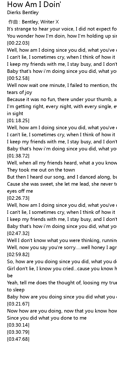 | [01:18.63] | Well, how am I doing since you did, what you've done to me |