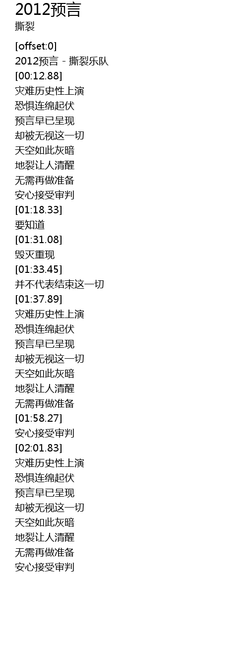 | [00:02.57] | 2012预言 - 撕裂乐队 |