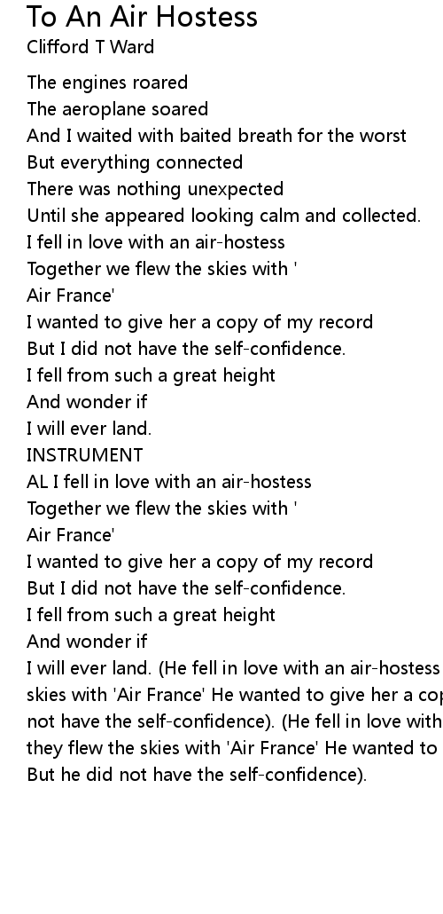 I will ever land. (He fell in love with an air-hostess Together they flew the skies with 'Air France' He wanted to give her a copy of his record But he did not have the self-confidence). (He fell in love with an air-hostess Together they flew the skies with 'Air France' He wanted to give her a copy of his record But he did not have the self-confidence). |
