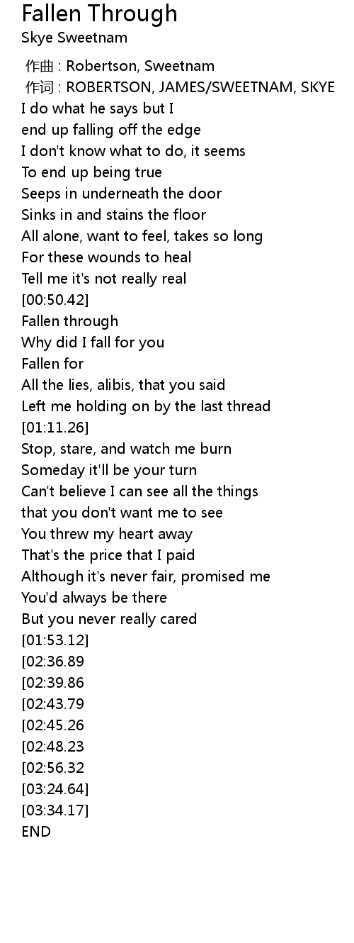 | [02:56.74][02:36.89][01:53.94] | Fallen through |