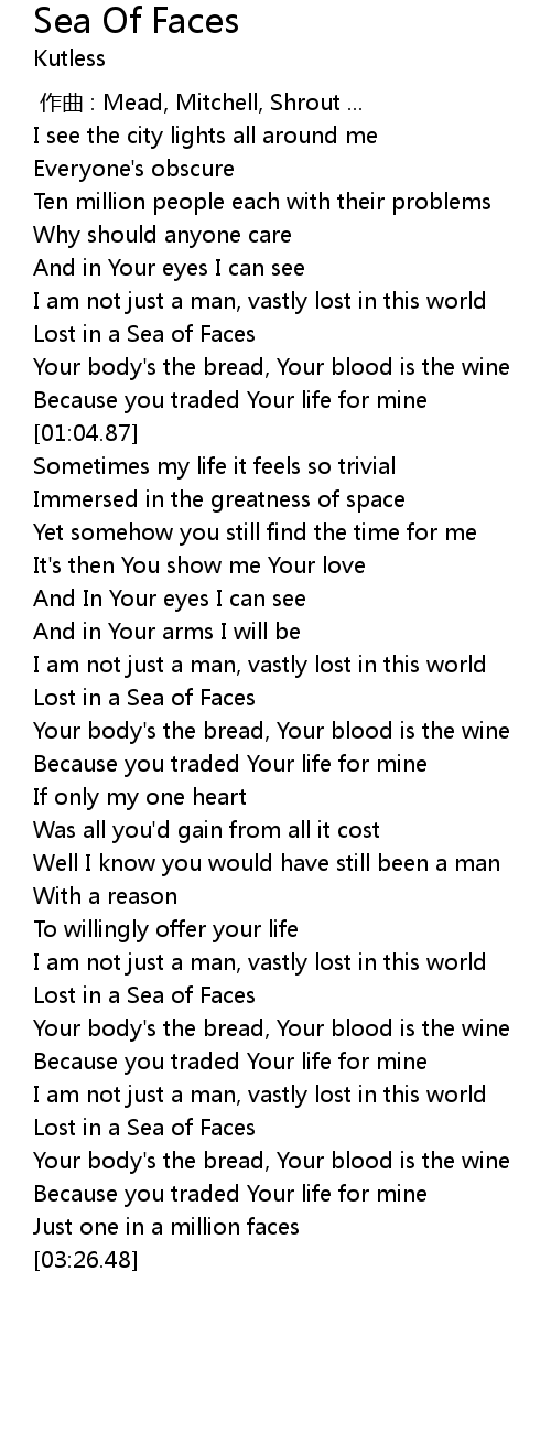 | [02:43.95] | Your body's the bread, Your blood is the wine |