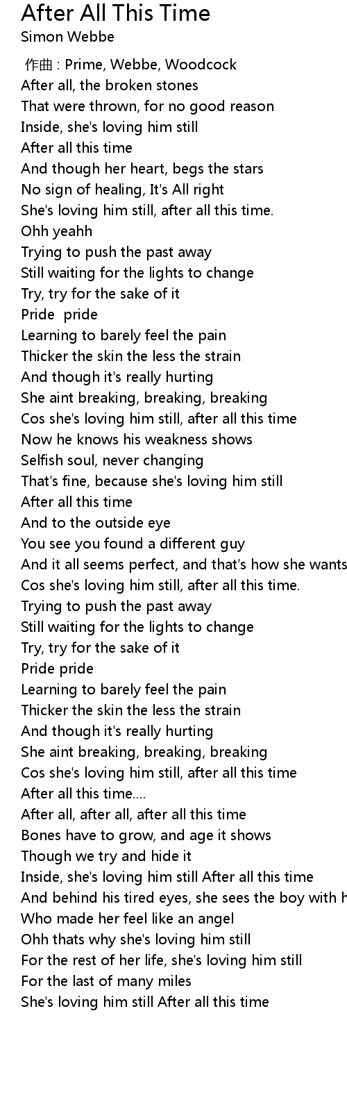 | [02:55.06] | Inside, she's loving him still After all this time |