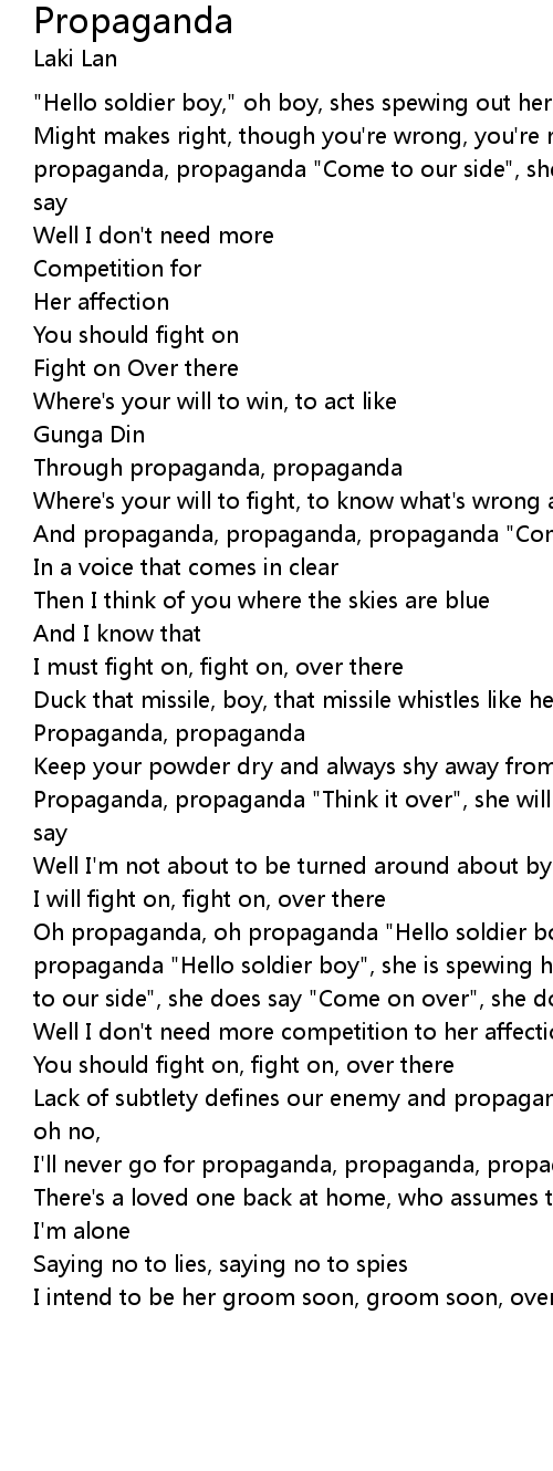 Oh propaganda, oh propaganda "Hello soldier boy", she is spewing her propaganda, propaganda "Hello soldier boy", she is spewing her propaganda, propaganda "Come to our side", she does say "Come on over", she does say |