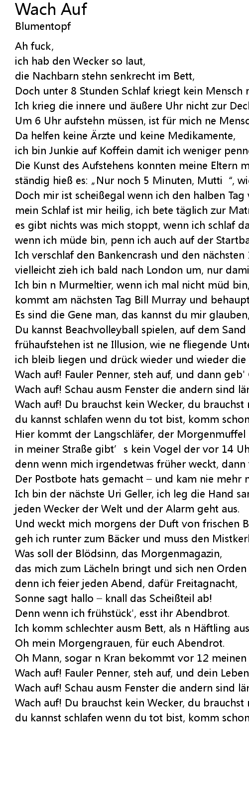 | Wach auf! Schau ausm Fenster die andern sind l ngst wach. | |
