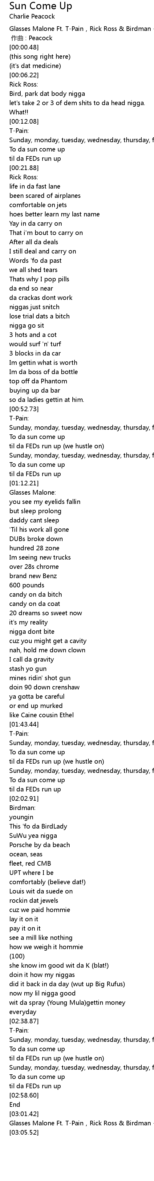 | [03:01.62] | Glasses Malone Ft. T-Pain,Rick Ross & Birdman - Sun Come Up |