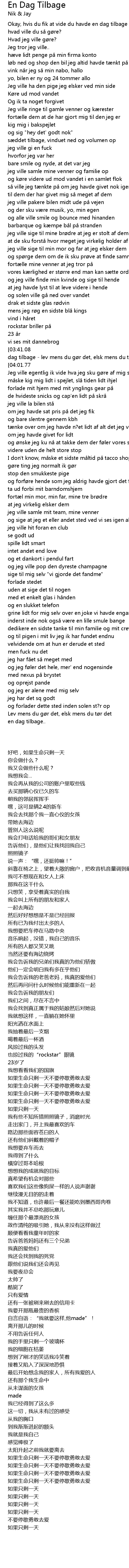 | [03:46.12][03:41.08][03:35.94][03:30.69][02:00.47][01:55.33][01:50.29][01:45.06] | En dag tilbage - lev mens du gør det, elsk mens du tør det |