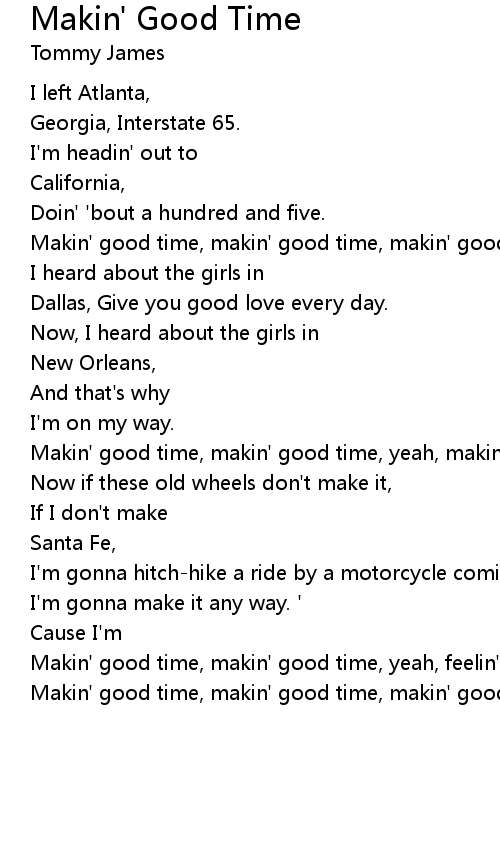 Makin' good time, makin' good time, yeah, feelin' so fine. |